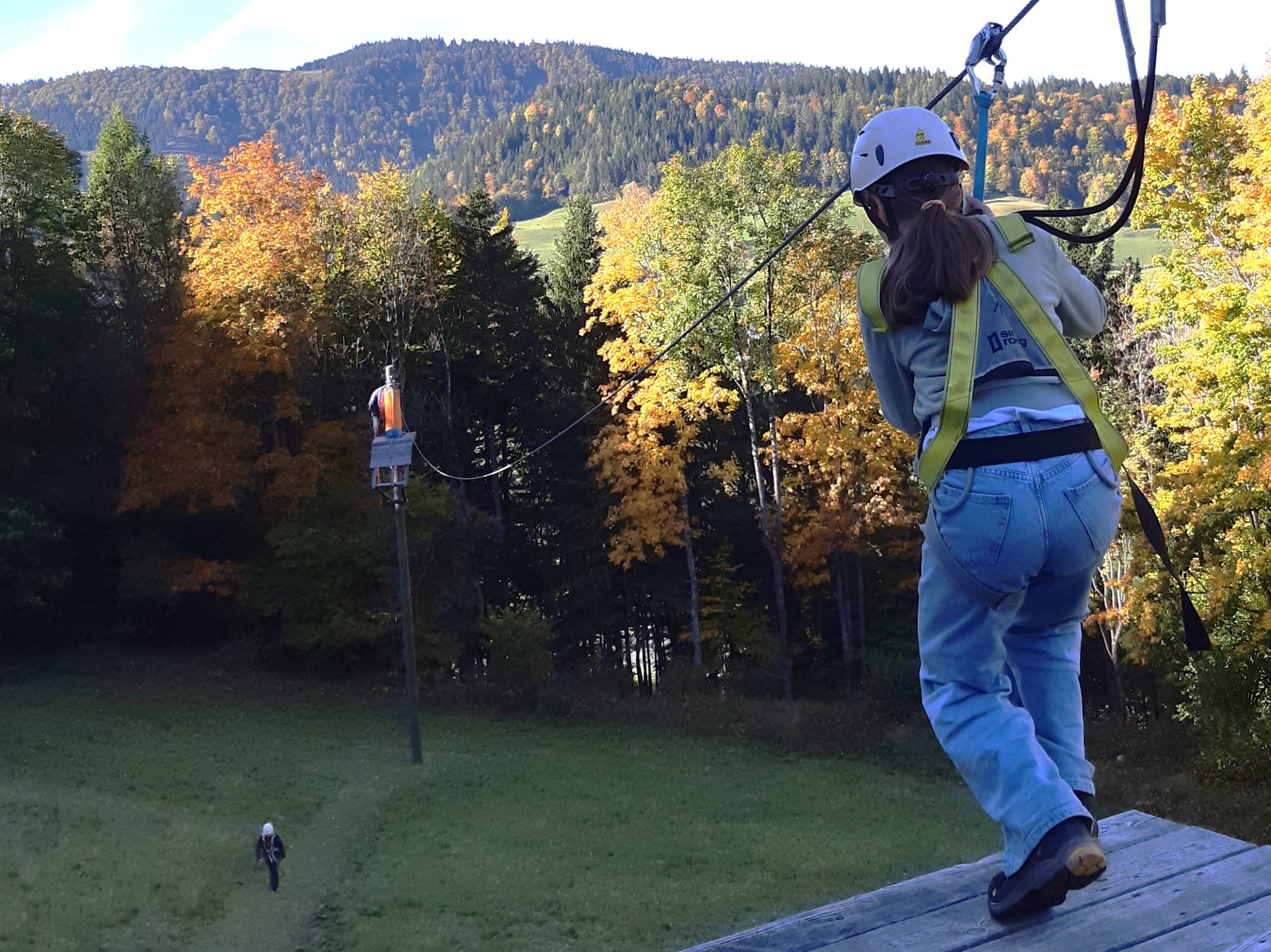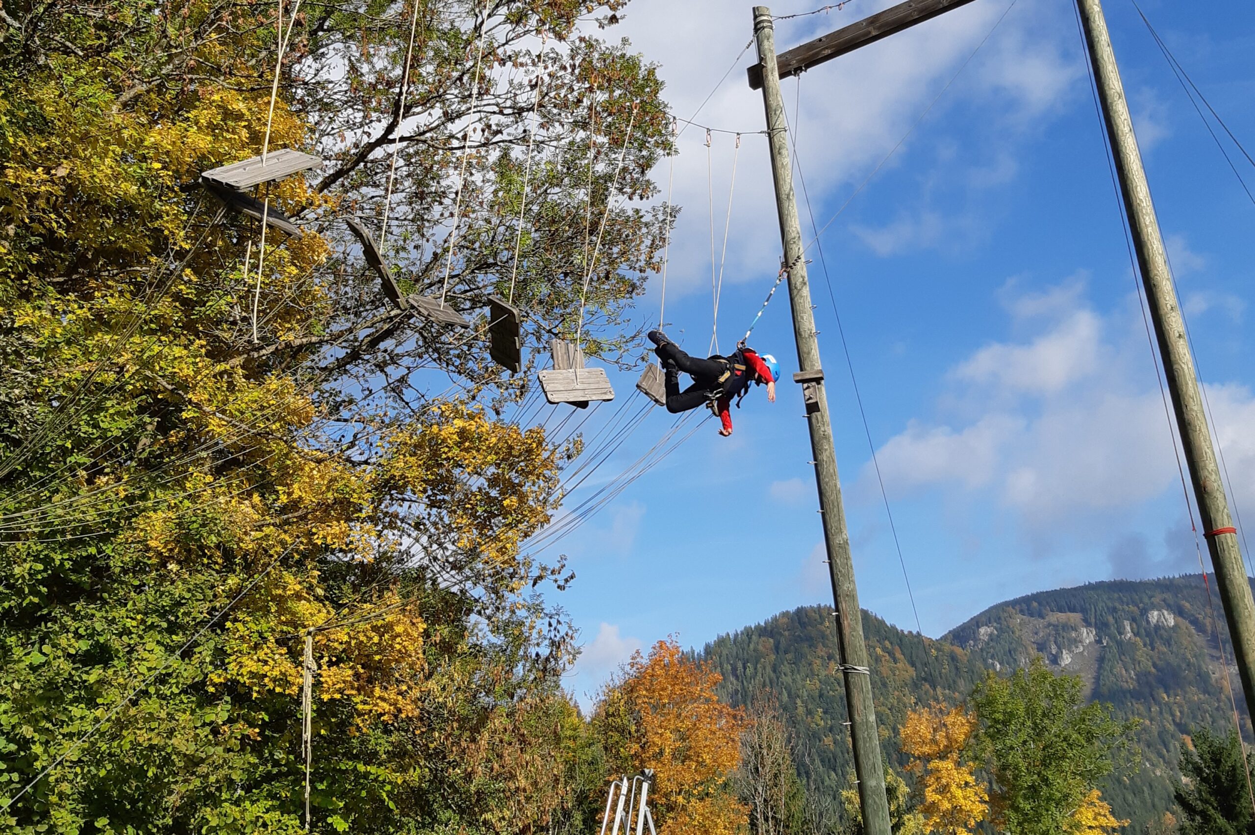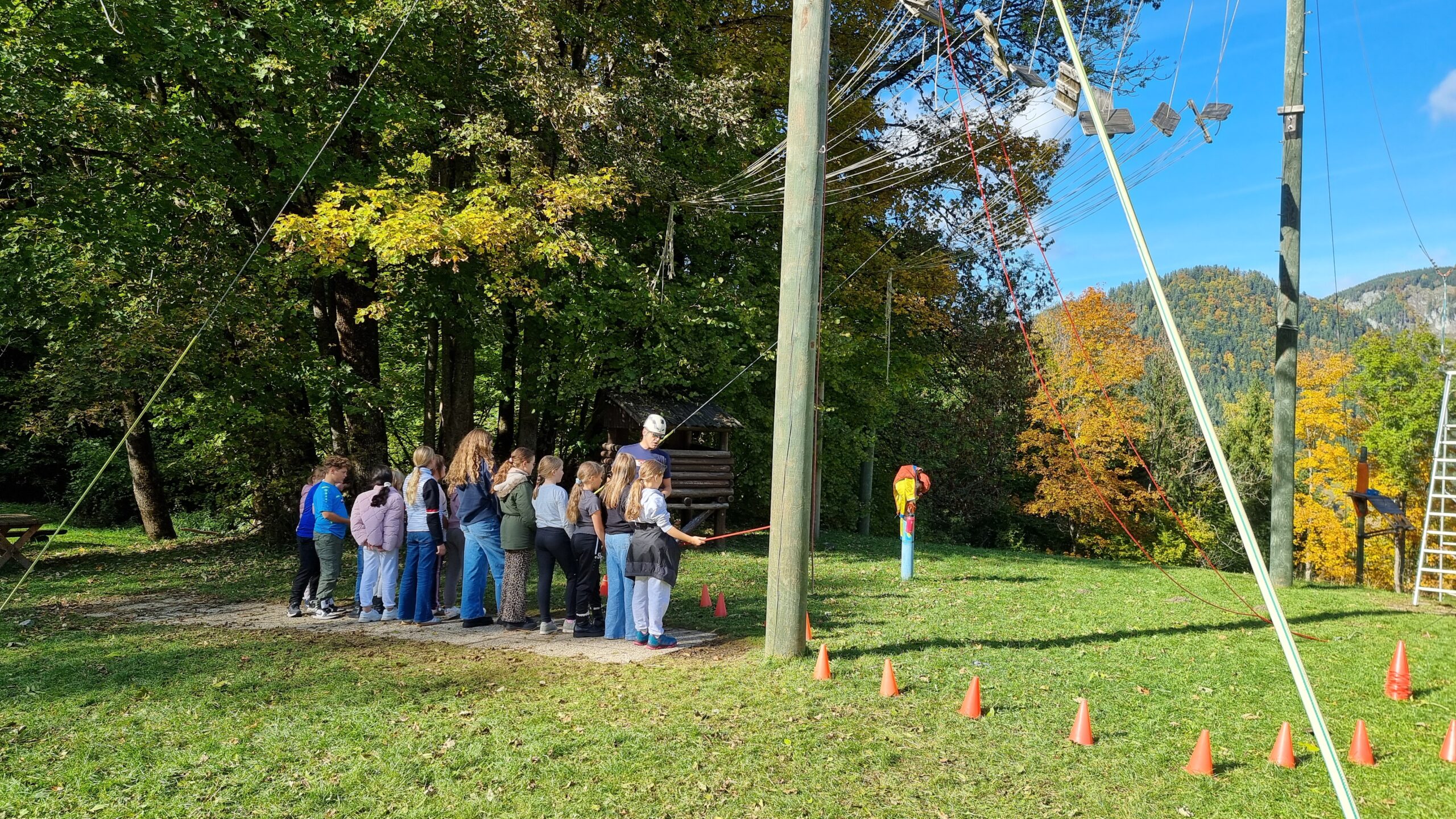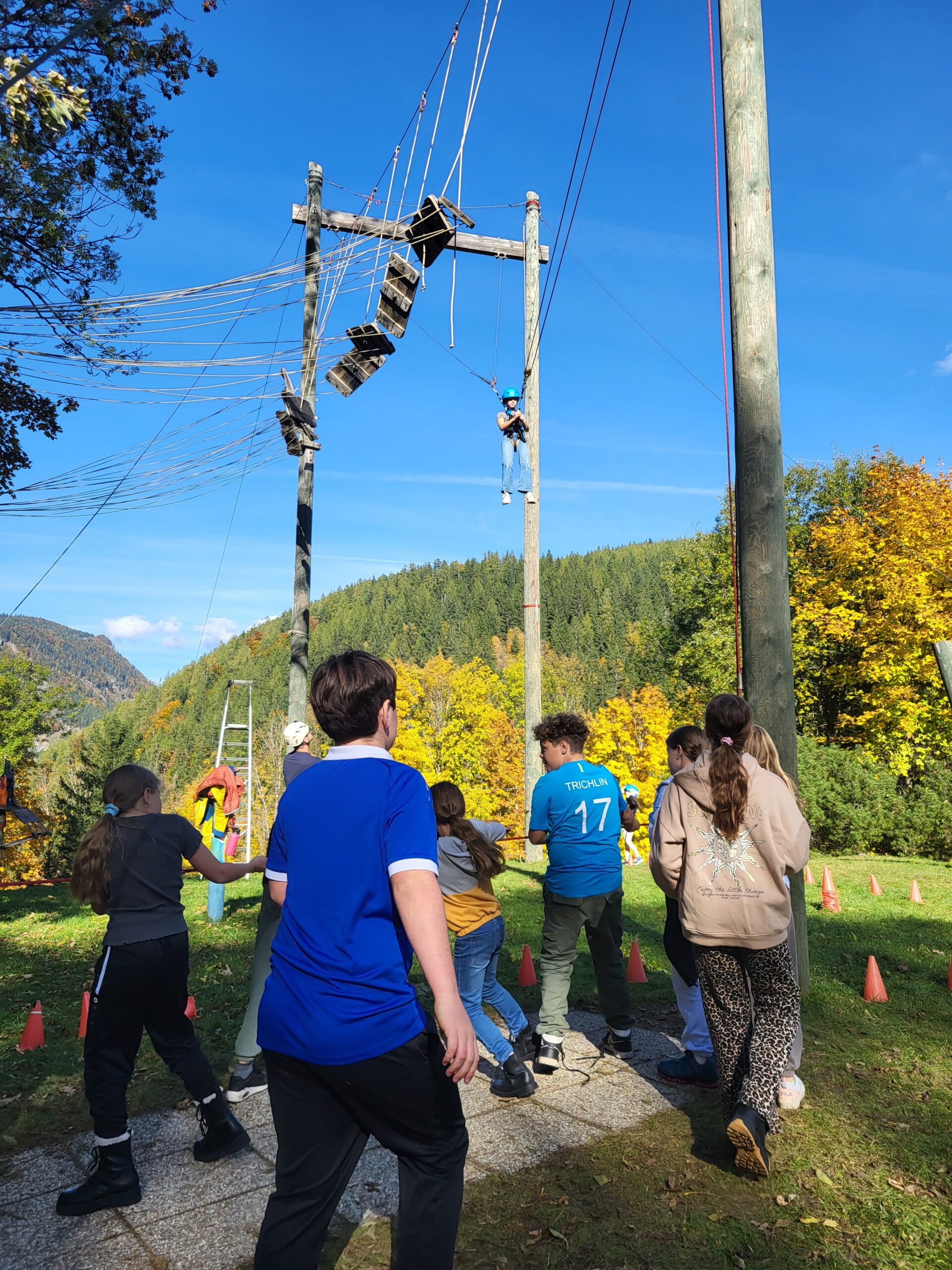Mit viel Teamgeist und gegenseitiger Unterstützung meisterten wir verschiedene Herausforderungen. Besonders aufregend waren der Flying Fox und die Big-Swing-Schaukel. Gerade bei der großen Schaukel war Zusammenarbeit von großer Bedeutung. Die gesamte Klasse zog eine Schülerin bzw. einen Schüler hoch hinauf, bis “Stopp” gerufen wurde. So konnte jede und jeder die eigene Grenze erfahren und gleichzeitig musste der Rest der Klasse so aufmerksam sein, diese Grenze auch zu wahren. Die Aufgabe erforderte Vertrauen, Mut und Rücksicht aufeinander.