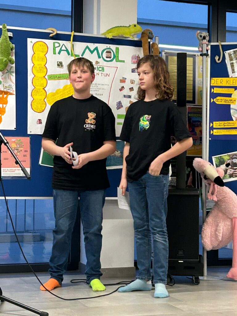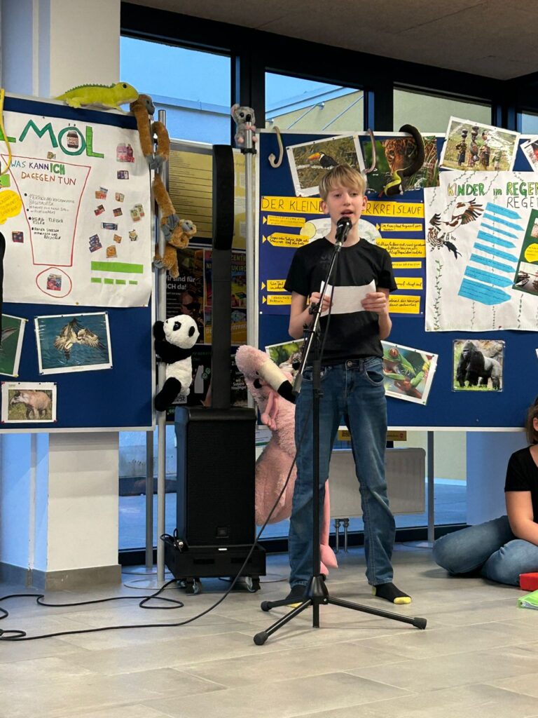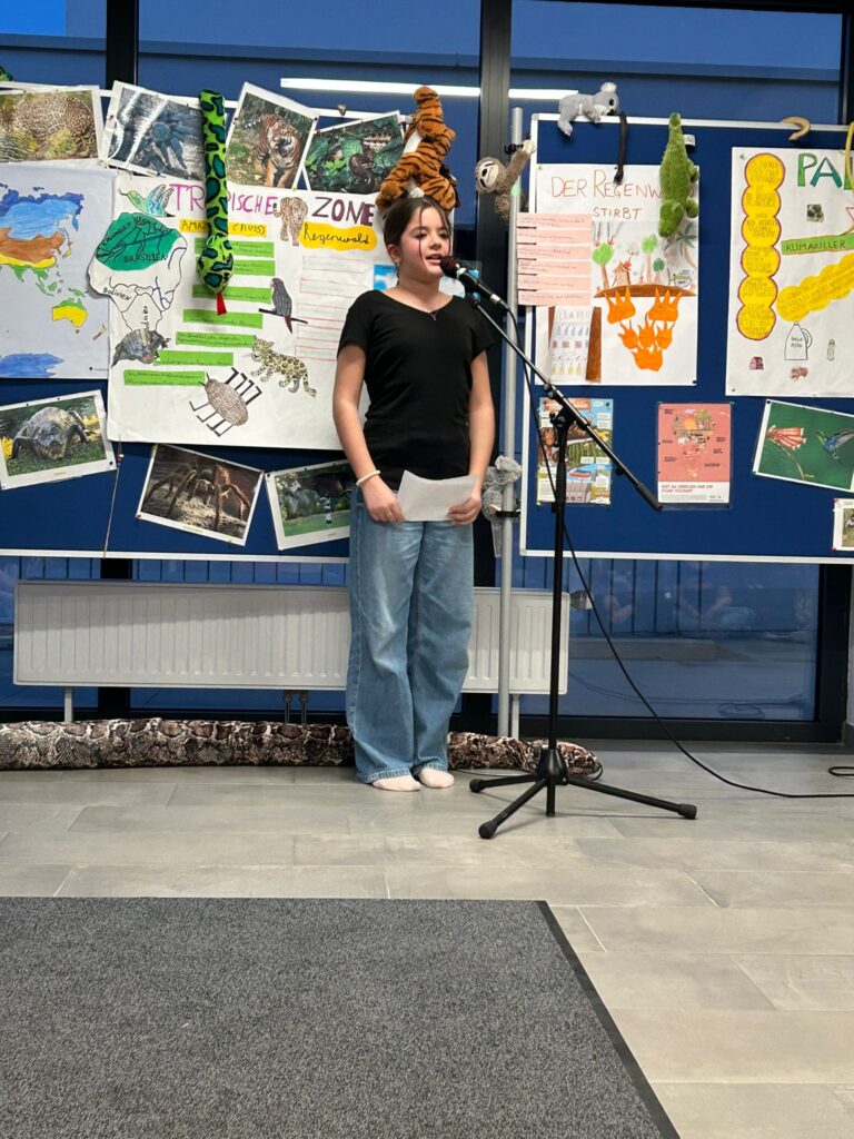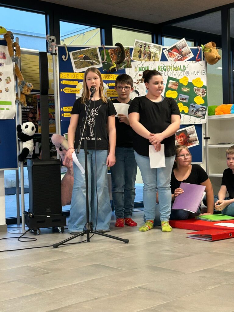 Schon beim Betreten des Raumes wurde klar, wie intensiv sich die Kinder in den vergangenen Wochen mit dem Thema „Brasilianischer Regenwald“ auseinandergesetzt hatten. Die jungen Expertinnen und Experten führten ihr Publikum tief in das Dickicht des Dschungels und erklärten mit beeindruckender Sicherheit die komplexen Zusammenhänge dieses wertvollen Ökosystems.