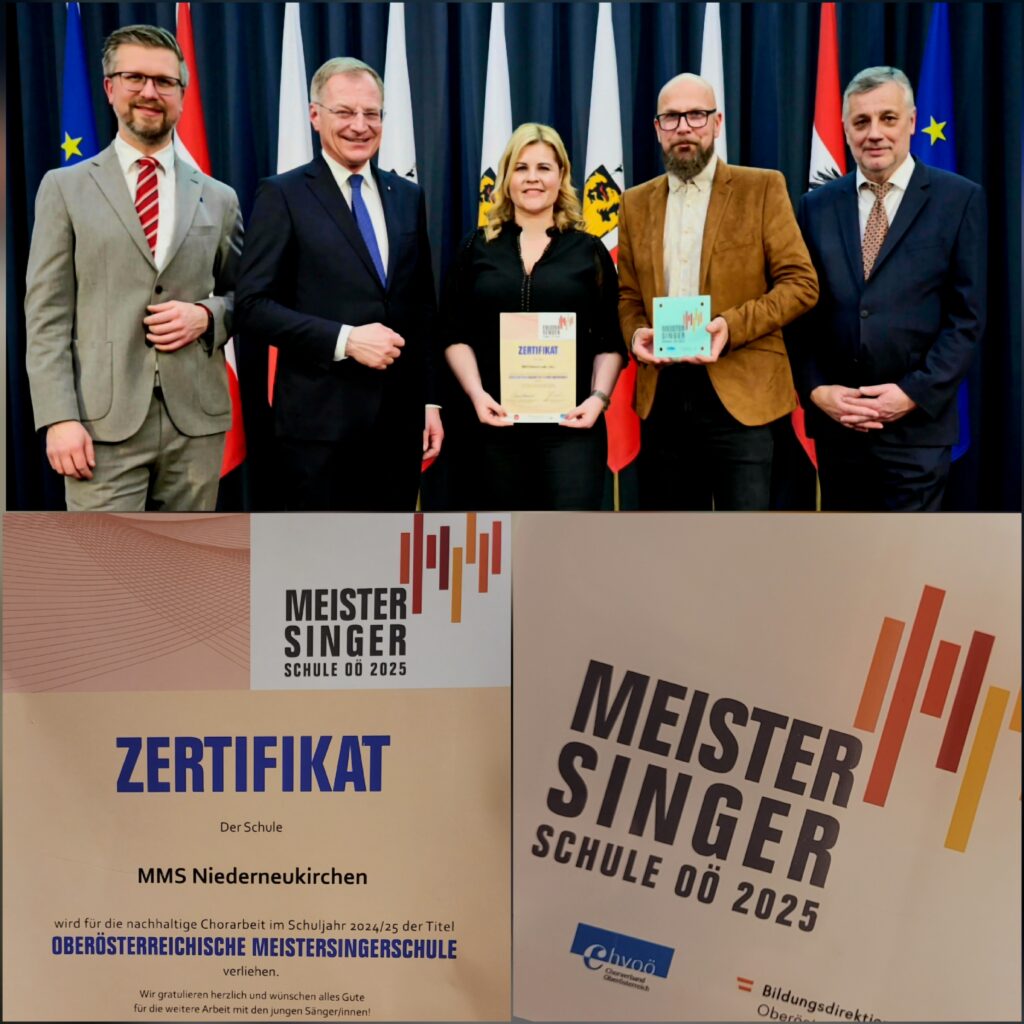 Am 10. Februar 2026 wurde unserer Schule zum 9. Mal in Folge das Meistersinger-Gütesiegel verliehen. Die Auszeichnung wurde im Steinernen Saal in Linz von Landeshauptmann Thomas Stelzer überreicht und würdigt die hervorragende Chorarbeit an unserer Schule.